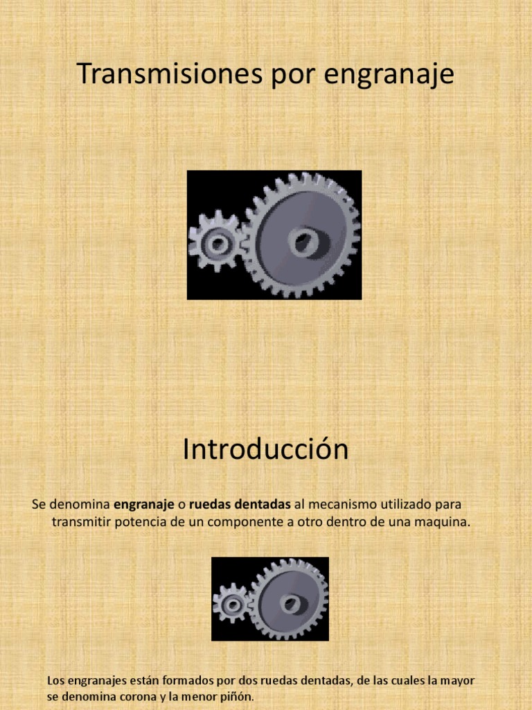 Se denomina engranaje o ruedas dentadas al mecanismo utilizado para transmitir potencia de un componente a otro dentro de una maquina.