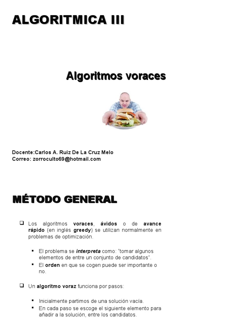 Garantiza siempre la solucin ptima? Para este sistema monetario s. Pero no siempre... Ejemplo. Supongamos que tenemos monedas de C = 6, 4, 1 . Queremos devolver 8. Algoritmo voraz. 1 moneda de 6 y 2 monedas de 1: total 3 monedas. Solucin ptima. 2 monedas de 4: total 2 monedas.