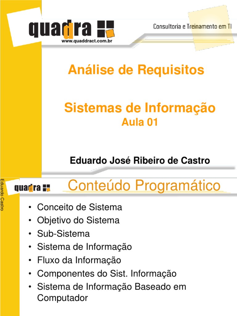 Conceito de Sistema Objetivo do Sistema Sub-Sistema Sistema de Informao Fluxo da Informao Componentes do Sist. Informao Sistema de Informao Baseado em Computador