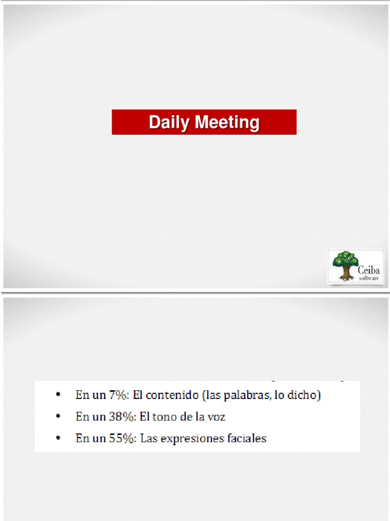La reunin diaria (daily meeting) es uno de los tres puntos de inspeccin y adaptacin en Scrum.