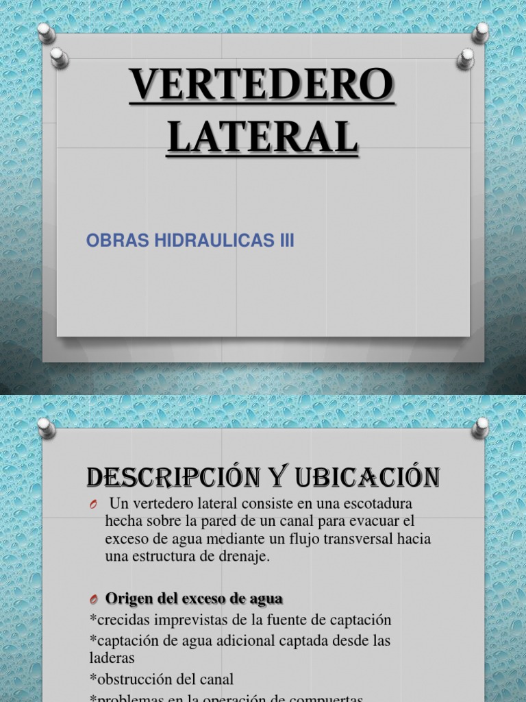 El diseo del clculo del un vertedero lateral consiste en calcular la longitud del vertedero para un caudal de diseo que se pretende tomar de un canal o un ro. Hay cuatro cantidades que definen el funcionamiento de un vertedero lateral que son: La descarga o gasto Q. El gradiente hidrulico hacia la cresta del vertedero. La velocidad de corriente. Longitud de la cresta.