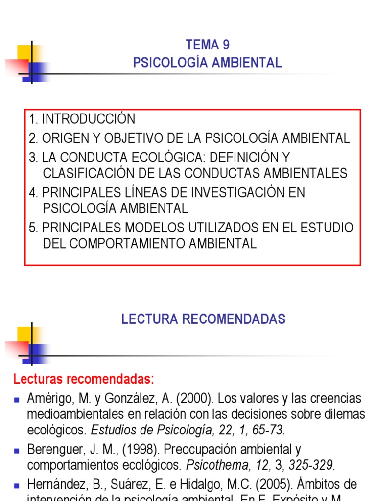 1. INTRODUCCIN 2. ORIGEN Y OBJETIVO DE LA PSICOLOGA AMBIENTAL 3. LA CONDUCTA ECOLGICA: DEFINICIN Y CLASIFICACIN DE LAS CONDUCTAS AMBIENTALES 4. PRINCIPALES LNEAS DE INVESTIGACIN EN PSICOLOGA AMBIENTAL 5. PRINCIPALES MODELOS UTILIZADOS EN EL ESTUDIO DEL COMPORTAMIENTO AMBIENTAL