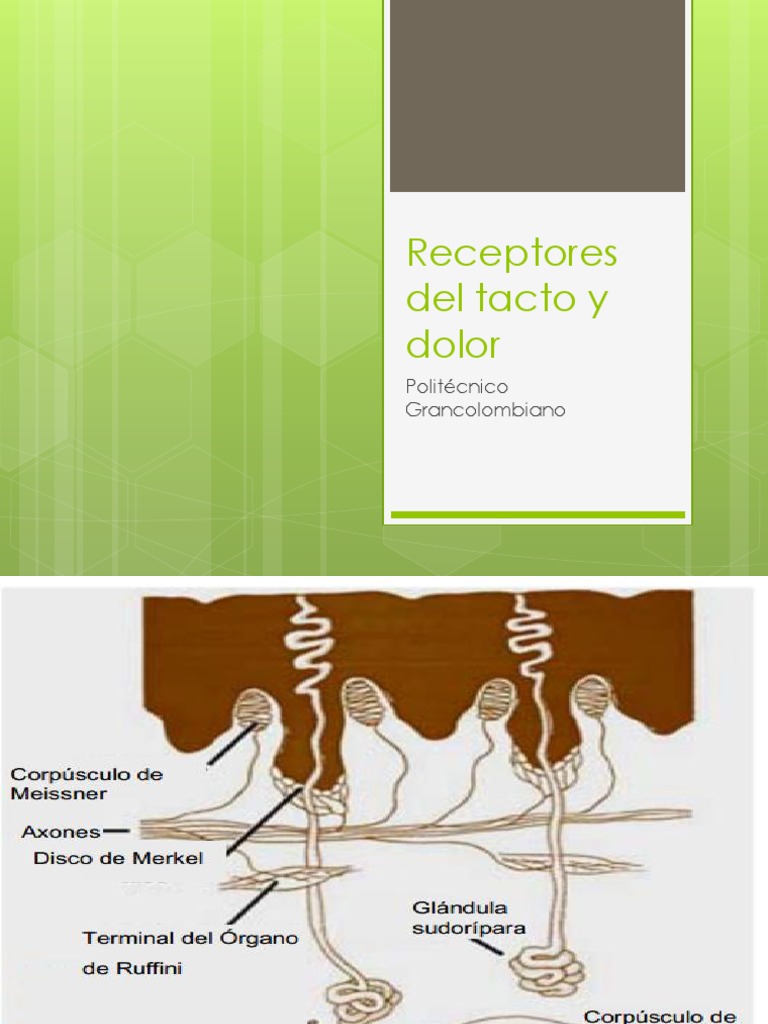 Corpsculos de Meissner: Es una terminacin encapsulada, se encuentran en gran cantidad en los pulpejos de los dedos. Se encuentran entre epidermis y dermis. Se relacionan con el tacto y la vibracin de baja frecuencia (30 a 40 Hz) de la piel sin pelo, sobretodo en la palma de las manos. Ayudan a discriminar en una superficie dura si estamos frente a madera, vidrio o cemento.