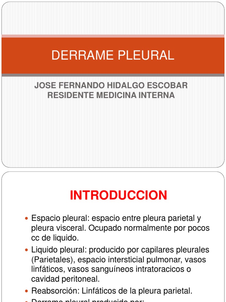 pleura visceral. Ocupado normalmente por pocos cc de liquido. Liquido pleural: producido por capilares pleurales (Parietales), espacio intersticial pulmonar, vasos linfticos, vasos sanguneos intratoracicos o cavidad peritoneal. Reabsorcin: Linfticos de la pleura parietal. Derrame pleural producido por: 1. Exceso de produccin de liquido. 2. Defecto de reabsorcin.