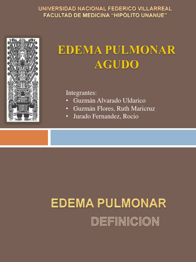 El edema pulmonar, es una acumulacin anormal de lquido en los espacios extravasculares y en los tejidos del pulmn, es una complicacin importante y potencialmente fatal de distintas enfermedades cardacas y pulmonares.