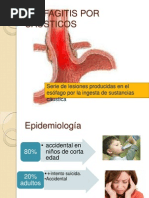 Inmediata: aparecen entre las 24 a 48 horas de la ingesta: Shock. Sepsis. Ulceras esofgicas y gastritis. Perforacin de vsceras huecas, con mediastinitis y/o peritonitis aguda. Hemorragia mediastinica. Fistula traqueoesofgica, esofagobronquial, pleural, etc. Hemorragias digestivas altas. Broncoaspiracion e insuficiencia respiratoria aguda. Tardas. Estenosis. Es la complicacin tarda ms temida. Se inicia entre las tercera y octava semana. Puede haber estenosis esofgica (ms frecuente en intoxicacin por lcalis) o estenosis antral o pilrica (en intoxicacin por cidos). Tambin es posible encontrar estenosis larngea. Alteraciones de la motilidad gstrica. Malignizacin. Su incidencia es del 3% y se presenta al cabo de 50 aos. El antecedente de intoxicacin custica aumenta en 1.000 veces la probabilidad de desarrollar cncer. El ms frecuente es el carcinoma de clulas escamosas.