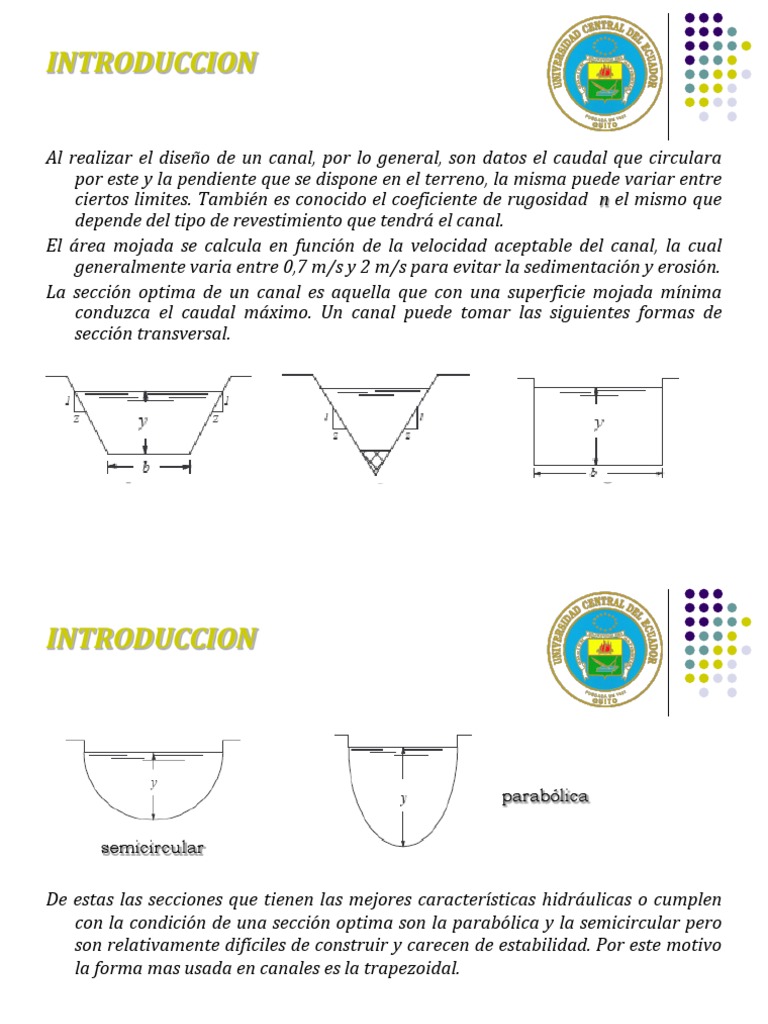 Al realizar el diseo de un canal, por lo general, son datos el caudal que circulara por este y la pendiente que se dispone en el terreno, la misma puede variar entre ciertos limites. Tambin es conocido el coeficiente de rugosidad n el mismo que depende del tipo de revestimiento que tendr el canal. El rea mojada se calcula en funcin de la velocidad aceptable del canal, la cual generalmente varia entre 0,7 m/s y 2 m/s para evitar la sedimentacin y erosin. La seccin optima de un canal es aquella que con una superficie mojada mnima conduzca el caudal mximo. Un canal puede tomar las siguientes formas de seccin transversal.