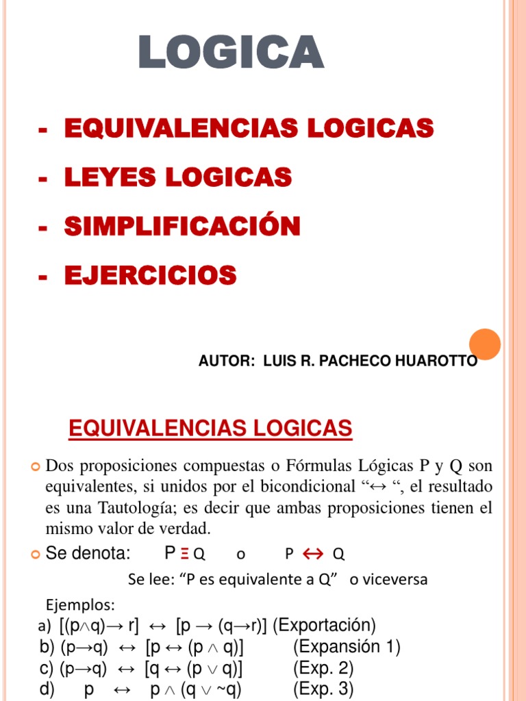Dos proposiciones compuestas o Frmulas Lgicas P y Q son equivalentes, si unidos por el bicondicional , el resultado es una Tautologa; es decir que ambas proposiciones tienen el mismo valor de verdad. Se denota: PQ o P Q Se lee: P es equivalente a Q o viceversa Ejemplos: a) [(pq) r] [p (qr)] (Exportacin) b) (pq) [p (p q)] (Expansin 1) c) (pq) [q (p q)] (Exp. 2) d) p p (q ~q) (Exp. 3) e) p p (q ~q) (Exp. 4)