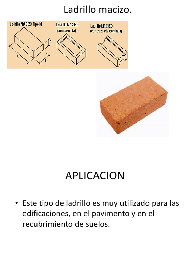 Ladrillo comn; este ladrillo esta destinado a la construccin, ya que esta hecho de arcilla de calidad inferior. Ladrillo refractario: este se utiliza para fabricar hornos ya que puede resistir temperaturas muy altas. Los ladrillos macizos son homogneos, de textura compacta y de grano fino y uniforme, su resistencia es muy mnima a compresin de 200 Kg. fuerza por centmetro al cuadrado. Estos ladrillos deben de poseer suficiente adherencia a los morteros.