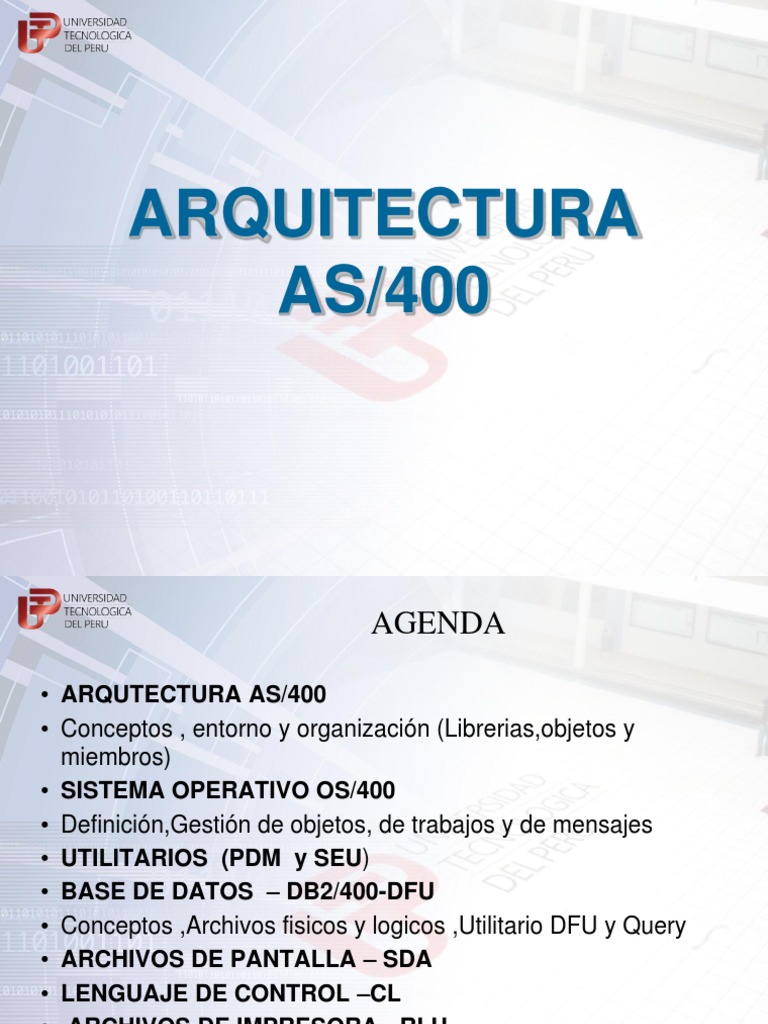 ARQUTECTURA AS/400 Conceptos , entorno y organizacin (Librerias,objetos y miembros) SISTEMA OPERATIVO OS/400 Definicin,Gestin de objetos, de trabajos y de mensajes UTILITARIOS (PDM y SEU) BASE DE DATOS DB2/400-DFU Conceptos ,Archivos fisicos y logicos ,Utilitario DFU y Query ARCHIVOS DE PANTALLA SDA LENGUAJE DE CONTROL CL ARCHIVOS DE IMPRESORA - RLU PROGRAMASION RPG/400
