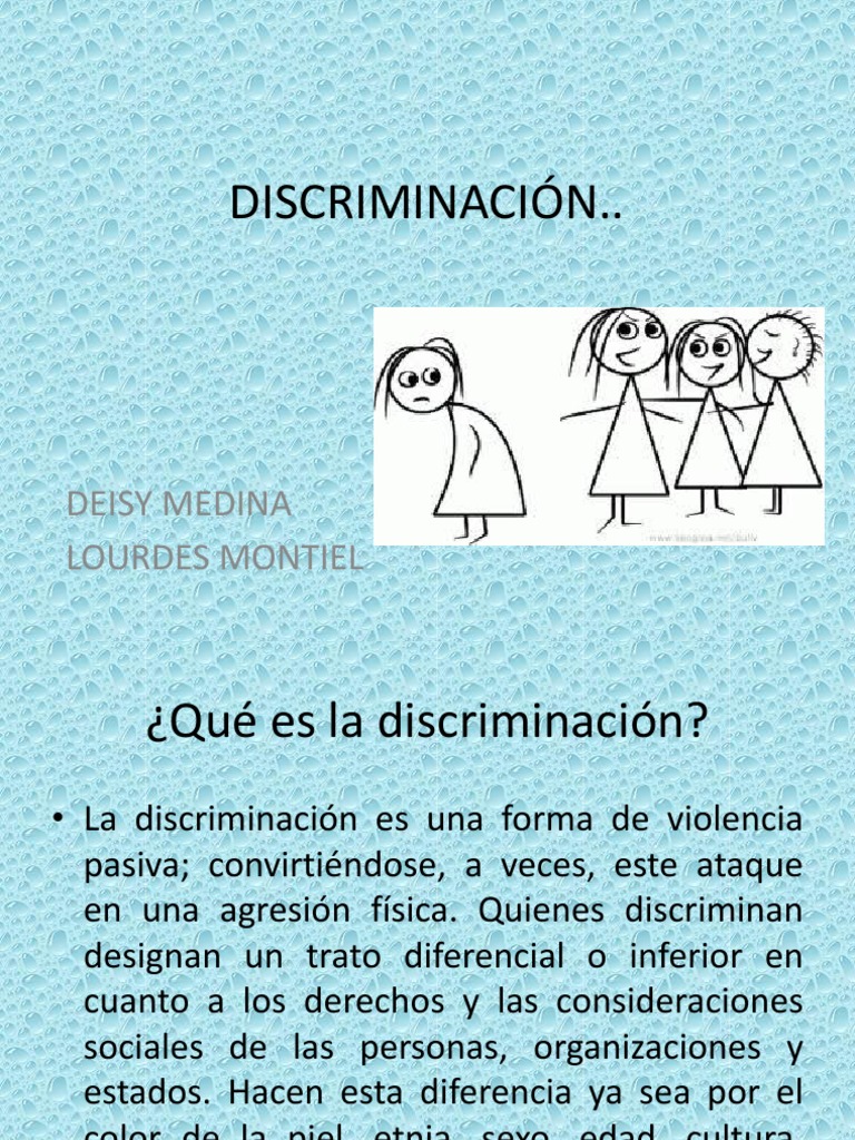 La discriminacin es una forma de violencia pasiva; convirtindose, a veces, este ataque en una agresin fsica. Quienes discriminan designan un trato diferencial o inferior en cuanto a los derechos y las consideraciones sociales de las personas, organizaciones y estados. Hacen esta diferencia ya sea por el color de la piel, etnia, sexo, edad, cultura, religin o ideologa.