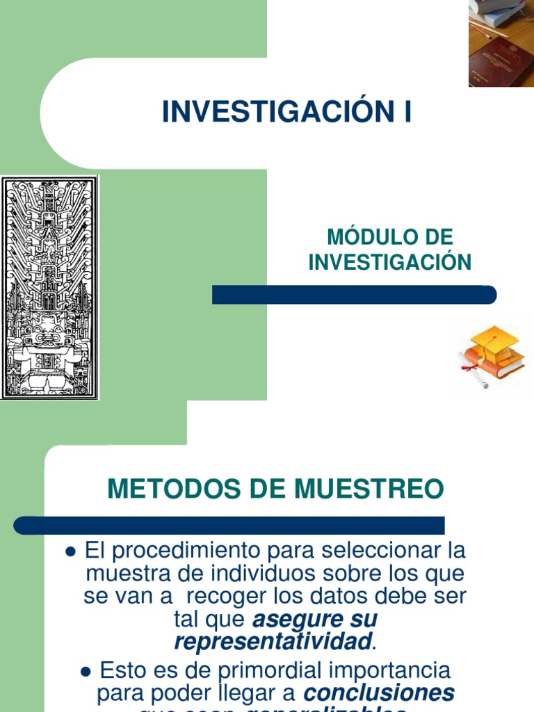 Los mtodos de muestreo probabilsticos se basan en el principio de equiprobabilidad. Es decir, todos los individuos de la poblacin tienen las mismas probabilidades de entrar a formar parte de a muestra. se recomienda utilizar mtodos probabilsticos siempre que sea posible, puesto que son los que aseguran mejor la representatividad de la muestra. Dentro de los mtodos probabilsticos se encuentran los siguientes: