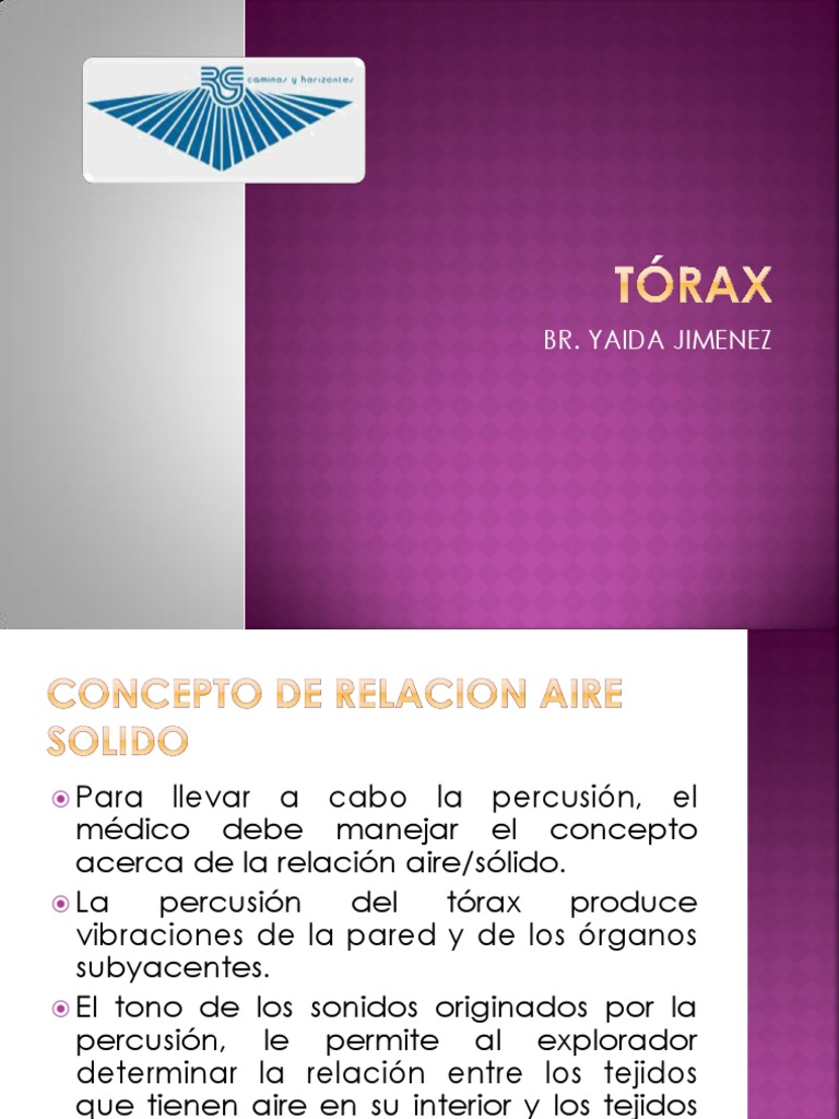 llevar a cabo la percusin, el mdico debe manejar el concepto acerca de la relacin aire/slido. La percusin del trax produce vibraciones de la pared y de los rganos subyacentes. El tono de los sonidos originados por la percusin, le permite al explorador determinar la relacin entre los tejidos que tienen aire en su interior y los tejidos slidos que existen en el rea subyacente a la percusin (relacin aire/slido).