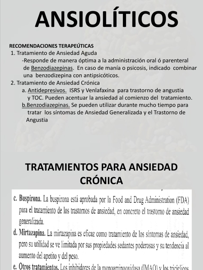 1. Tratamiento de Ansiedad Aguda -Responde de manera ptima a la administracin oral parenteral de Benzodiazepinas. En caso de mana o psicosis, indicado combinar una benzodizepina con antipsicticos. 2. Tratamiento de Ansiedad Crnica a. Antidepresivos. ISRS y Venlafaxina para trastorno de angustia y TOC. Pueden acentuar la ansiedad al comienzo del tratamiento. [Link]. Se pueden utilizar durante mucho tiempo para tratar los sntomas de Ansiedad Generalizada y el Trastorno de Angustia