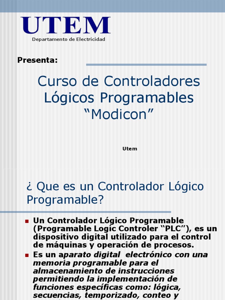Un Controlador Lgico Programable (Programable Logic Controler PLC), es un dispositivo digital utilizado para el control de mquinas y operacin de procesos. Es un aparato digital electrnico con una memoria programable para el almacenamiento de instrucciones permitiendo la implementacin de funciones especficas como: lgica, secuencias, temporizado, conteo y aritmtica; con el objeto de controlar mquinas y procesos.