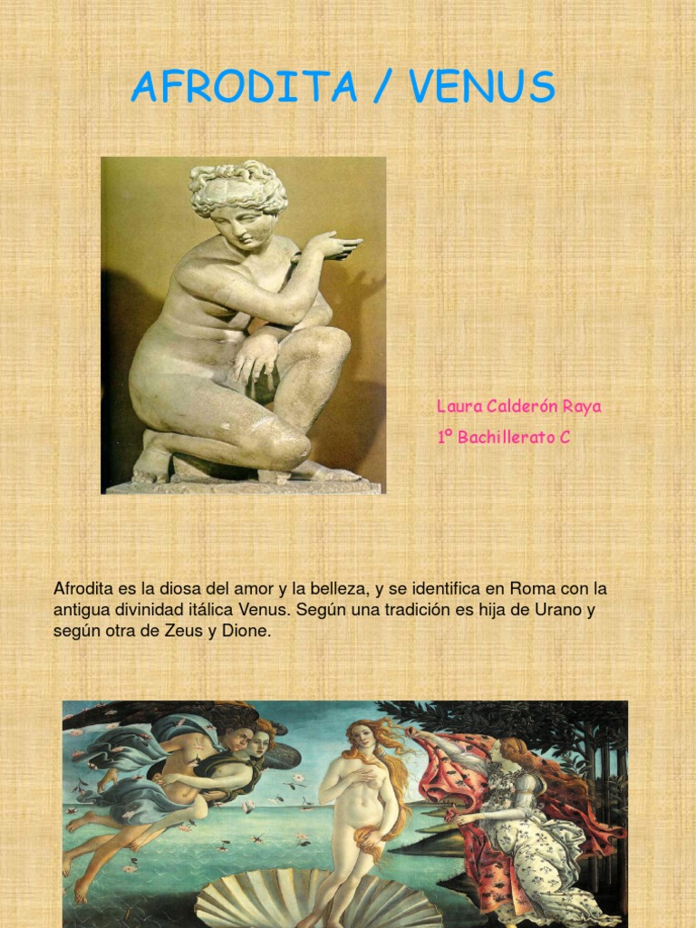 Afrodita es la diosa del amor y la belleza, y se identifica en Roma con la antigua divinidad itlica Venus. Segn una tradicin es hija de Urano y segn otra de Zeus y Dione.