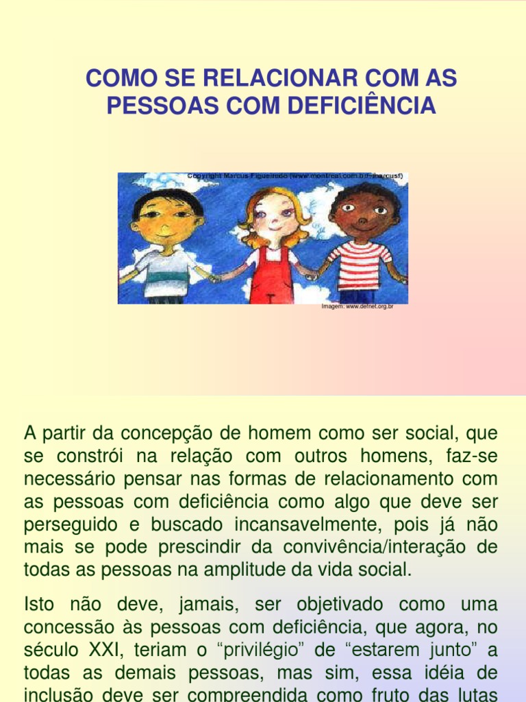 A partir da concepo de homem como ser social, que se constri na relao com outros homens, faz-se necessrio pensar nas formas de relacionamento com as pessoas com deficincia como algo que deve ser perseguido e buscado incansavelmente, pois j no mais se pode prescindir da convivncia/interao de todas as pessoas na amplitude da vida social. Isto no deve, jamais, ser objetivado como uma concesso s pessoas com deficincia, que agora, no sculo XXI, teriam o privilgio de estarem junto a todas as demais pessoas, mas sim, essa idia de incluso deve ser compreendida como fruto das lutas histricas desse segmento social, que no mais tolera a discriminao, a diferenciao, a segregao.