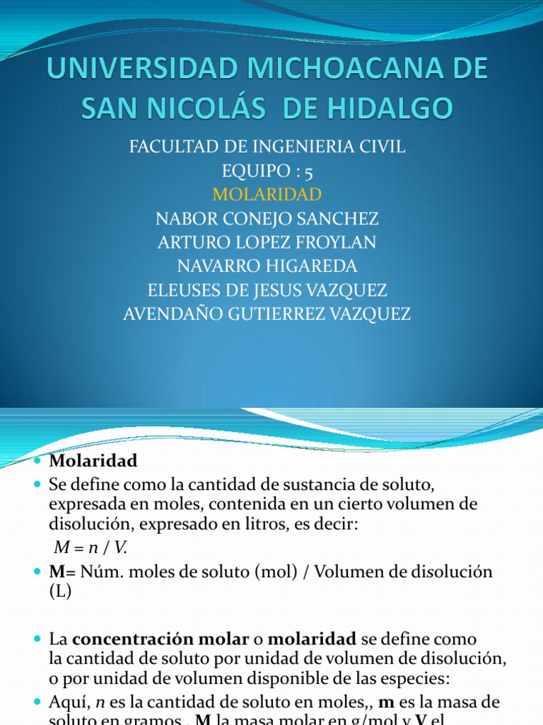 FACULTAD DE INGENIERIA CIVIL EQUIPO : 5 MOLARIDAD NABOR CONEJO SANCHEZ ARTURO LOPEZ FROYLAN NAVARRO HIGAREDA ELEUSES DE JESUS