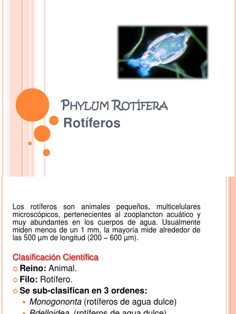 Clasificacin Cientfica Reino: Animal. Filo: Rotfero. Se sub-clasifican en 3 ordenes: Monogononta (rotferos de agua dulce) Bdelloidea (rotferos de agua dulce) Seisonidae (rotferos marinos)