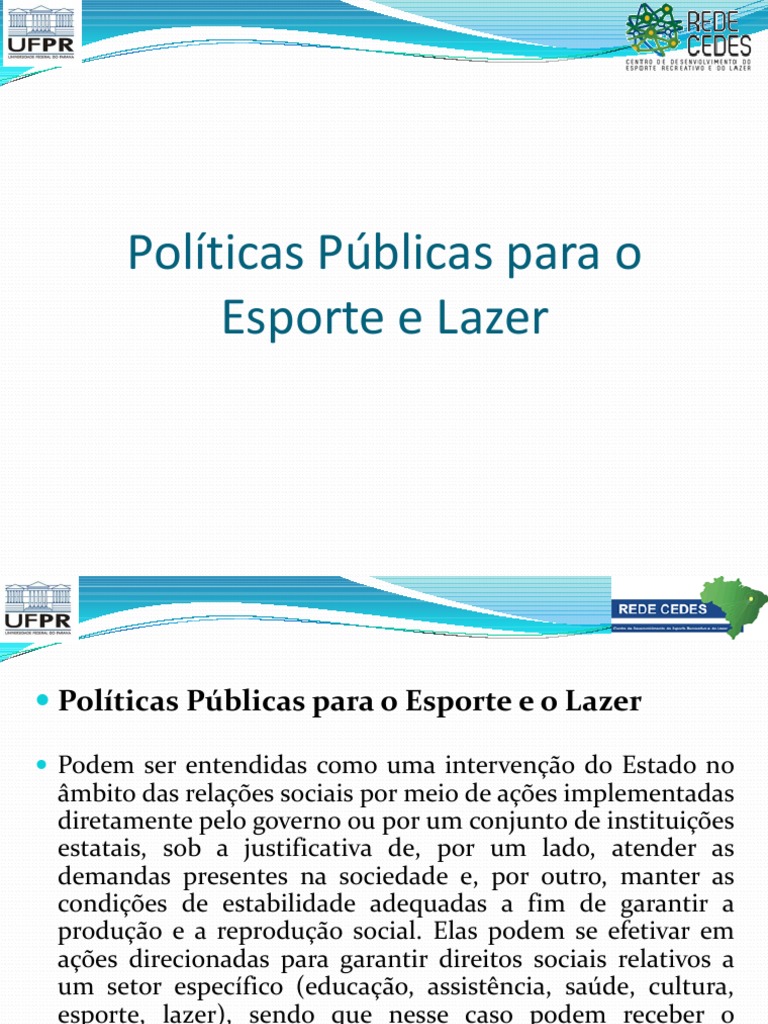 Projetos para Esporte e Lazer Projetos para Esporte e Lazer Polticas e Programas do Governo Federal Polticas e Programas do Governo Estadual Visita a CCE Polticas e Programas do Governo Municipal Visita a uma regional de Curitiba Pblico e Privado