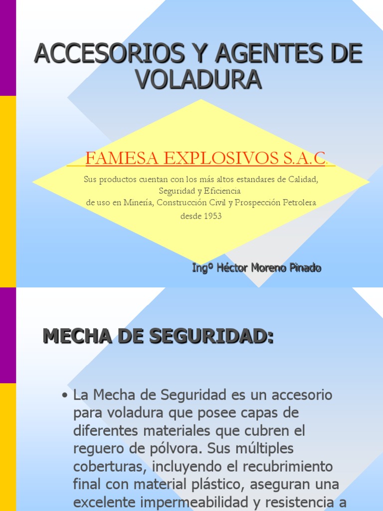 La Mecha de Seguridad es un accesorio para voladura que posee capas de diferentes materiales que cubren el reguero de plvora. Sus mltiples coberturas, incluyendo el recubrimiento final con material plstico, aseguran una excelente impermeabilidad y resistencia a la abrasin, an en condiciones ms exigentes, adems de minimizar las chispas laterales.