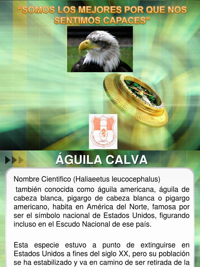 Nombre Cientifico (Haliaeetus leucocephalus) tambin conocida como guila americana, guila de cabeza blanca, pigargo de cabeza blanca o pigargo americano, habita en Amrica del Norte, famosa por ser el smbolo nacional de Estados Unidos, figurando incluso en el Escudo Nacional de ese pas. Esta especie estuvo a punto de extinguirse en Estados Unidos a fines del siglo XX, pero su poblacin se ha estabilizado y va en camino de ser retirada de la lista de especies en peligro del Gobierno de los Estados Unidos.