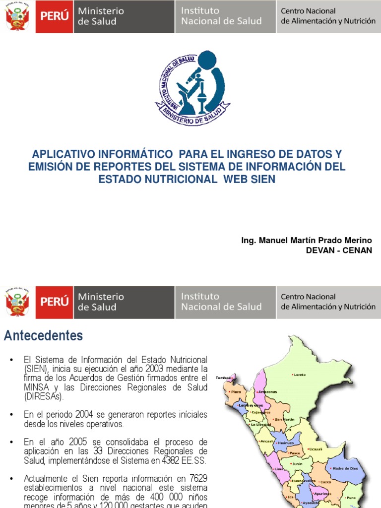 El Sistema de Informacin del Estado Nutricional (SIEN), inicia su ejecucin el ao 2003 mediante la firma de los Acuerdos de Gestin firmados entre el MINSA y las Direcciones Regionales de Salud (DIRESAs). En el periodo 2004 se generaron reportes inciales desde los niveles operativos. En el ao 2005 se consolidaba el proceso de aplicacin en las 33 Direcciones Regionales de Salud, implementndose el Sistema en 4382 EE.SS. Actualmente el Sien reporta informacin en 7629 establecimientos a nivel nacional este sistema recoge informacin de ms de 400 000 nios menores de 5 aos y 120 000 gestantes que acuden mensualmente a los establecimientos de salud
