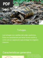 ORDEN QUELONIOS (Tortugas y galpagos) Coraza con caparazn dorsal o espaldar y peto ventral. En este caparazn estn fundidas las vrtebras torcicas y las costillas. Poco odo pero buena vista y olfato. Ovparos que entierran los huevos. Tamaos que llegan hasta los dos metros de longitud y 750 kilos de la tortuga Laud. Las terrestres como la de las tortugas de las Galpagos pesan unos 300 kg y llegan a vivir hasta los 250 aos.