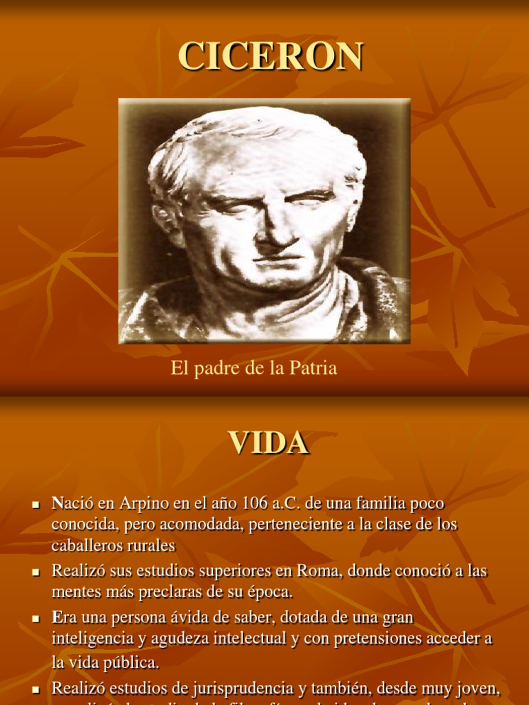 Entre sus maestros estuvieron el epicreo Fedro y el acadmico Filn de Larisa; en Grecia y Asia Menor, a donde viaj para proseguir sus estudios de filosofa recibi enseanzas del famoso estoico Posidonio y del eclctico Antoco de Ascaln. Al formarse el triunvirato con Pompeyo, Craso y Csar, ste ltimo busc la amistad de Cicern sin conseguirlo, por lo que pagara las consecuencias: fue desterrado por mediacin del tribuno de la plebe Clodio a causa de la ejecucin ilegal de ciudadanos romanos (Catilina y sus partidarios) y sus bienes se confiscaron.