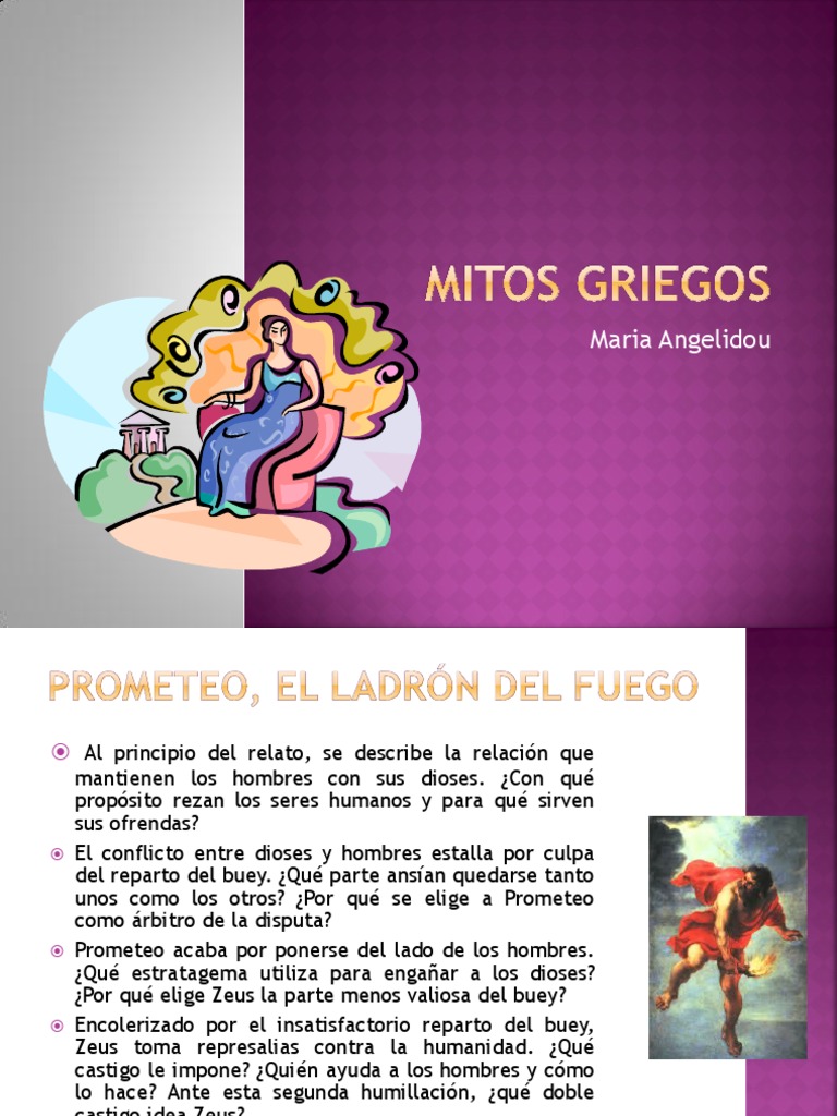 mantienen los hombres con sus dioses. Con qu propsito rezan los seres humanos y para qu sirven sus ofrendas? El conflicto entre dioses y hombres estalla por culpa del reparto del buey. Qu parte ansan quedarse tanto unos como los otros? Por qu se elige a Prometeo como rbitro de la disputa? Prometeo acaba por ponerse del lado de los hombres. Qu estratagema utiliza para engaar a los dioses? Por qu elige Zeus la parte menos valiosa del buey? Encolerizado por el insatisfactorio reparto del buey, Zeus toma represalias contra la humanidad. Qu castigo le impone? Quin ayuda a los hombres y cmo lo hace? Ante esta segunda humillacin, qu doble castigo idea Zeus? El titn Prometeo es admirado por todo el mundo a causa de su sabidura y sensatez. Qu curioso pasaje pone de manifiesto el poder de su razn?