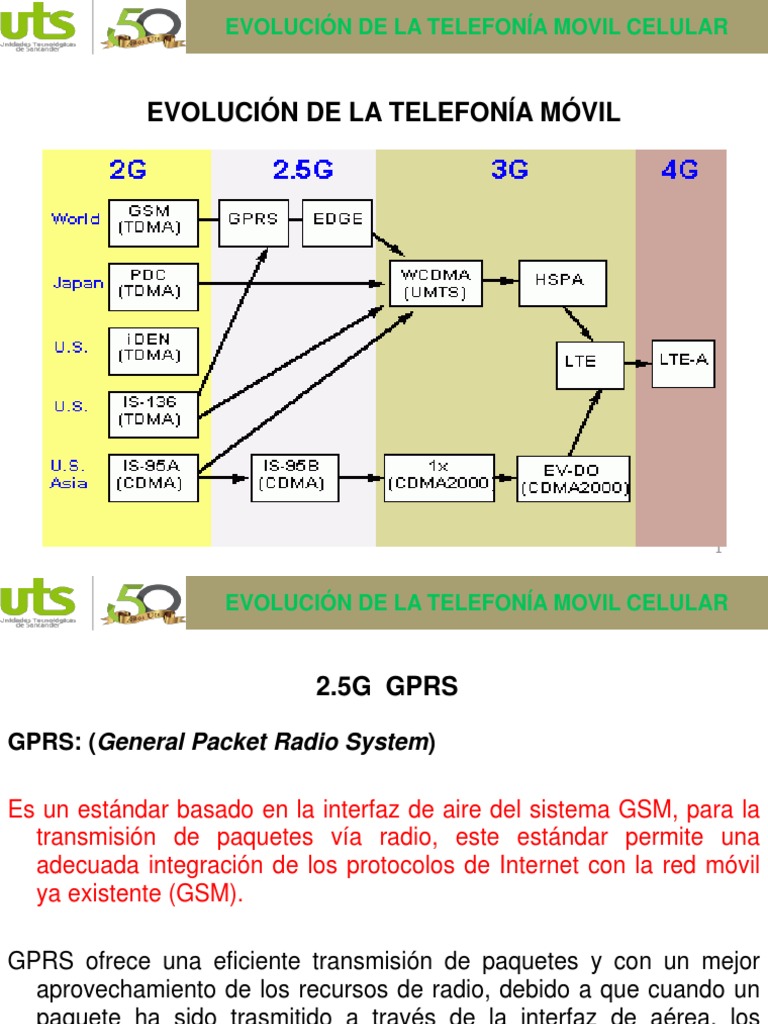 UMTS evoluciona a HSPA en sus dos versiones HSDPA y HSUPA. HSPA: High Speed Packet Access Tasas Tericas de transmisin: HSDPA o High Speed Downlink Packet Access: 14,4Mbps HSUPA o High Speed Uplink Packet Access: 5,7Mbps HSPA es una mejora de la interfaz de radio de UMTS (WCDMA) que provee una mayor capacidad de transmisin en los enlaces de bajada y subida y la posibilidad de desarrollar nuevos servicios que requieran altas tasas de transferencia.