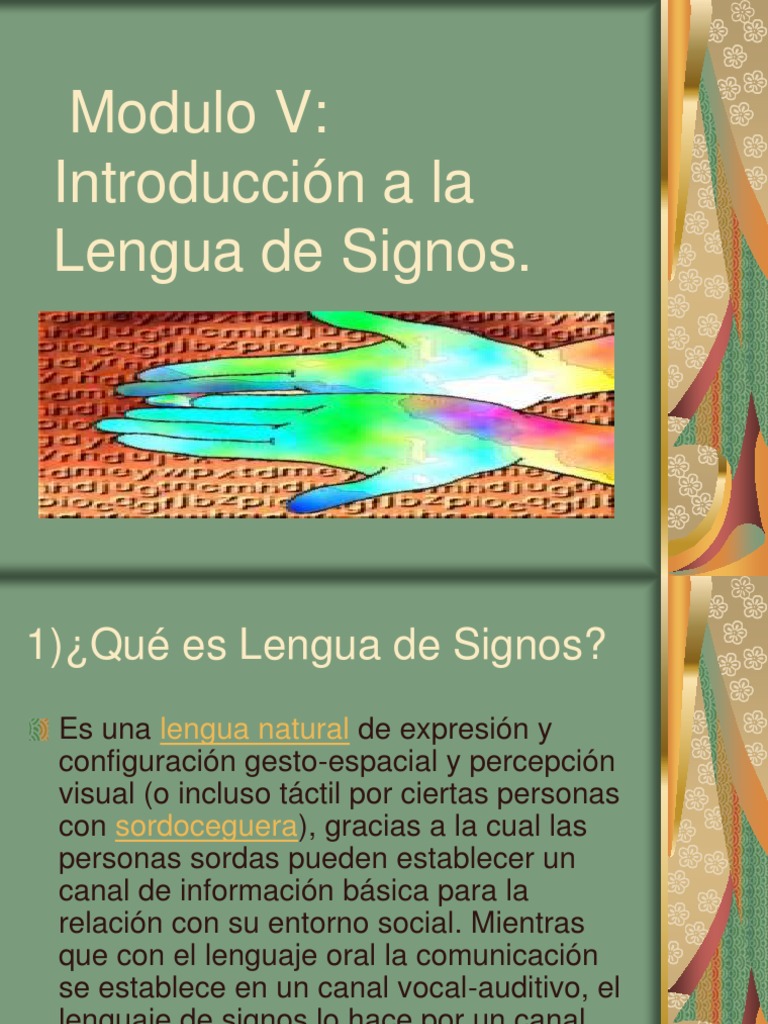 Es una lengua natural de expresin y configuracin gesto-espacial y percepcin visual (o incluso tctil por ciertas personas con sordoceguera), gracias a la cual las personas sordas pueden establecer un canal de informacin bsica para la relacin con su entorno social. Mientras que con el lenguaje oral la comunicacin se establece en un canal vocal-auditivo, el lenguaje de signos lo hace por un canal gesto-viso-espacial.