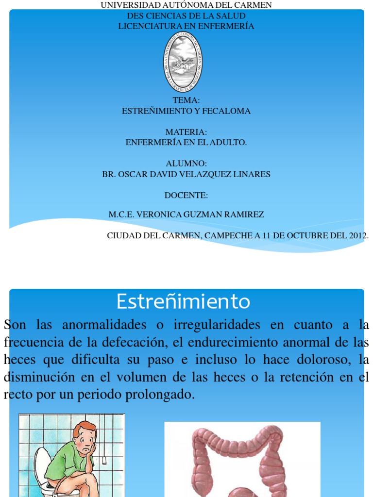 TEMA: ESTREIMIENTO Y FECALOMA MATERIA: ENFERMERA EN EL ADULTO. ALUMNO: BR. OSCAR DAVID VELAZQUEZ LINARES DOCENTE: M.C.E. VERONICA GUZMAN RAMIREZ CIUDAD DEL CARMEN, CAMPECHE A 11 DE OCTUBRE DEL 2012.