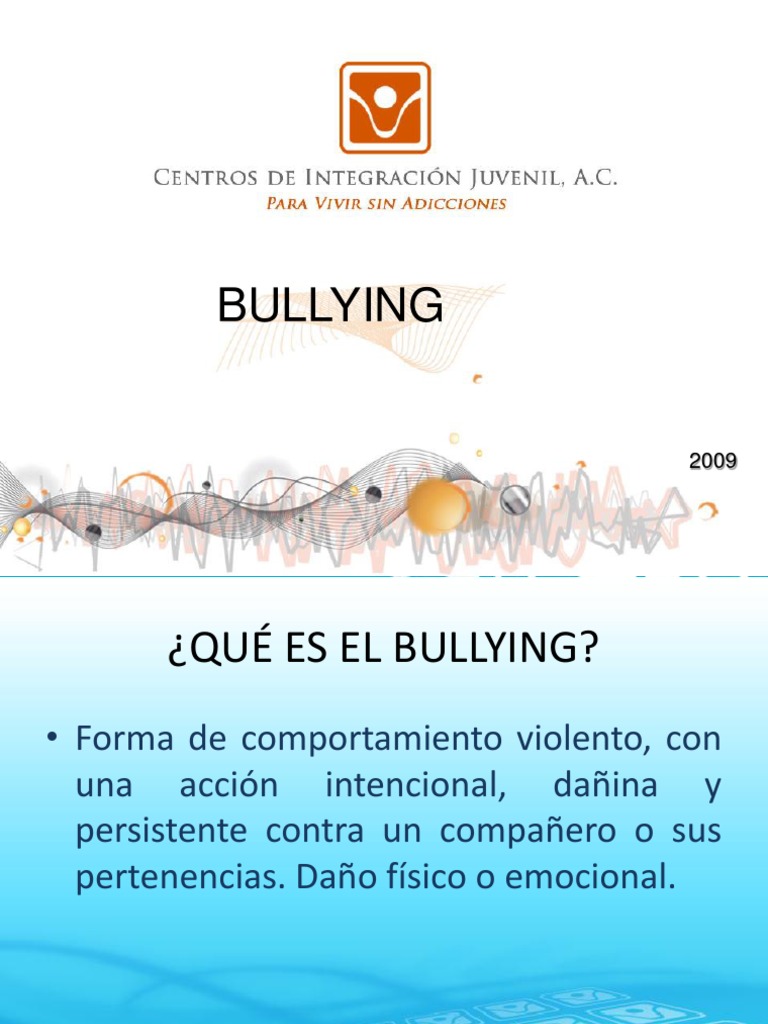 Forma de comportamiento violento, con una accin intencional, daina y persistente contra un compaero o sus pertenencias. Dao fsico o emocional.