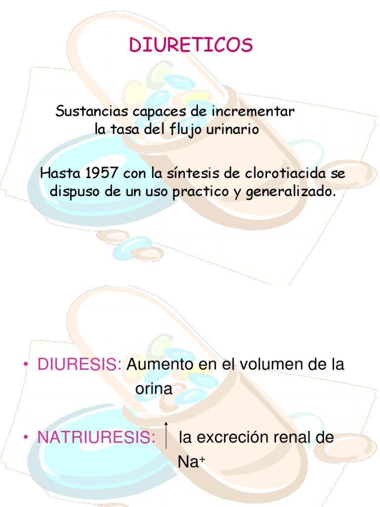 Sustancias capaces de incrementar la tasa del flujo urinario Hasta 1957 con la sntesis de clorotiacida se dispuso de un uso practico y generalizado.
