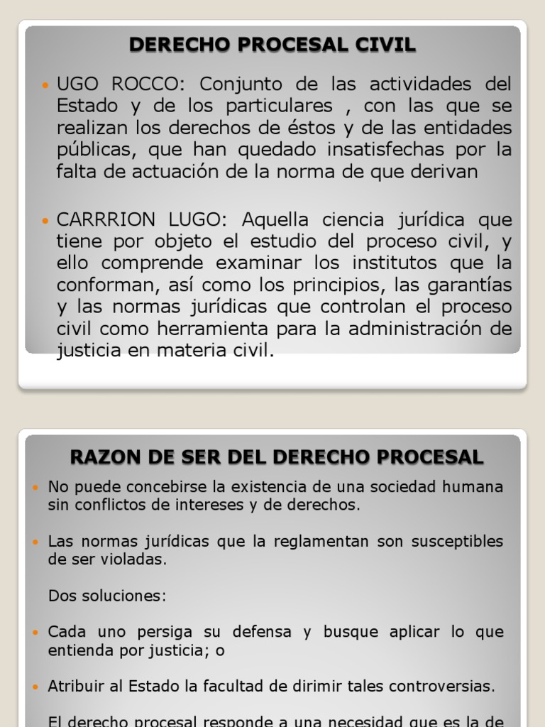 UGO ROCCO: Conjunto de las actividades del Estado y de los particulares , con las que se realizan los derechos de stos y de las entidades pblicas, que han quedado insatisfechas por la falta de actuacin de la norma de que derivan CARRRION LUGO: Aquella ciencia jurdica que tiene por objeto el estudio del proceso civil, y ello comprende examinar los institutos que la conforman, as como los principios, las garantas y las normas jurdicas que controlan el proceso civil como herramienta para la administracin de justicia en materia civil.