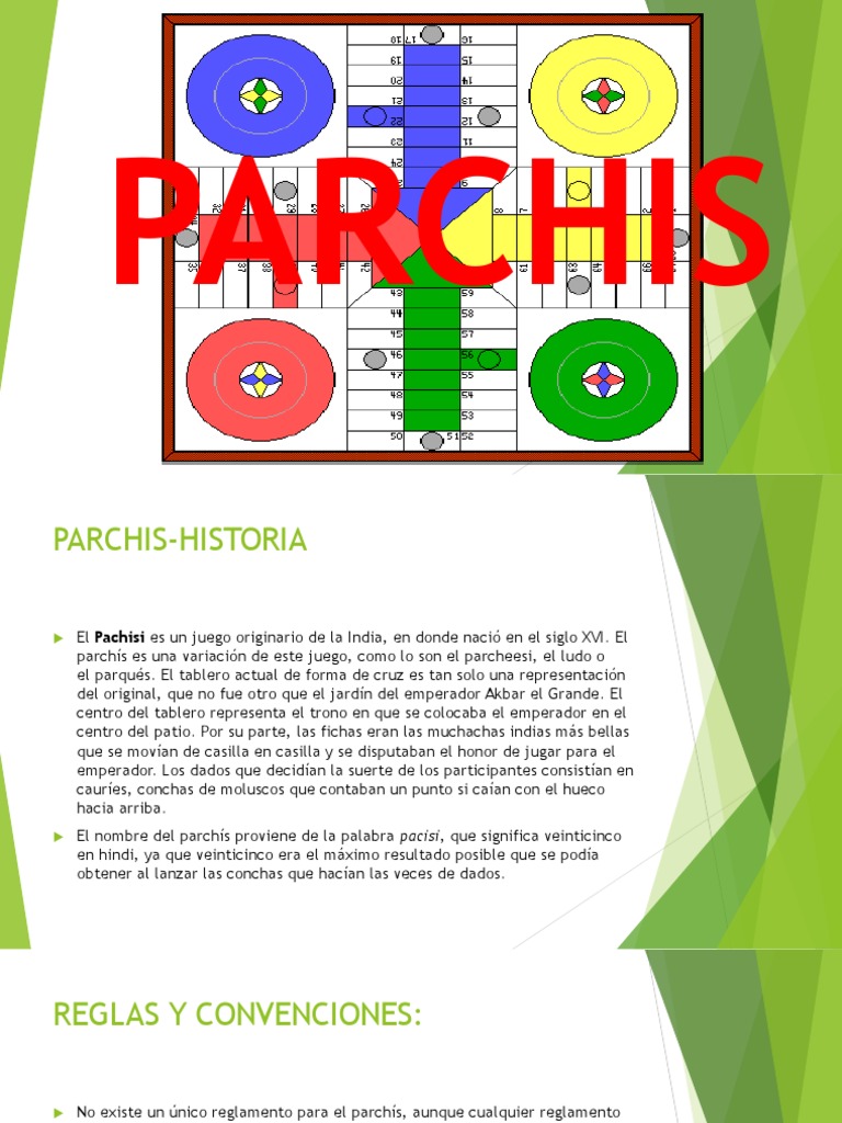 El Pachisi es un juego originario de la India, en donde naci en el siglo XVI. El parchs es una variacin de este juego, como lo son el parcheesi, el ludo o el parqus. El tablero actual de forma de cruz es tan solo una representacin del original, que no fue otro que el jardn del emperador Akbar el Grande. El centro del tablero representa el trono en que se colocaba el emperador en el centro del patio. Por su parte, las fichas eran las muchachas indias ms bellas que se movan de casilla en casilla y se disputaban el honor de jugar para el emperador. Los dados que decidan la suerte de los participantes consistan en caures, conchas de moluscos que contaban un punto si caan con el hueco hacia arriba. El nombre del parchs proviene de la palabra pacisi, que significa veinticinco en hindi, ya que veinticinco era el mximo resultado posible que se poda obtener al lanzar las conchas que hacan las veces de dados.