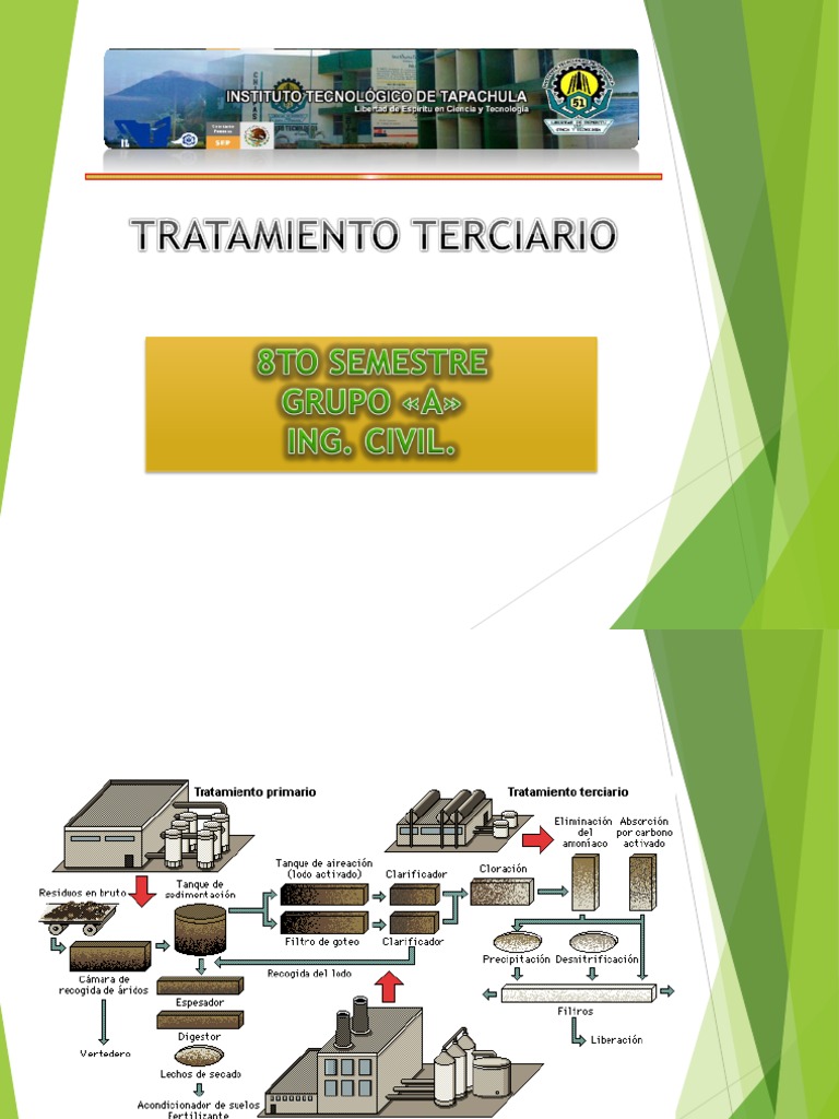 Este tratamiento consiste en un proceso fsicoqumico que utiliza la precipitacin, la filtracin y/o la cloracin para reducir drsticamente los niveles para reducir drsticamente los niveles de nutrientes inorgnicos, especialmente los fosfatos y nitratos del efluente final. El tratamiento terciario proporciona proporciona una etapa final para aumentar la calidad del efluente al estndar requerido, antes de que este sea descargado al ambiente receptor.