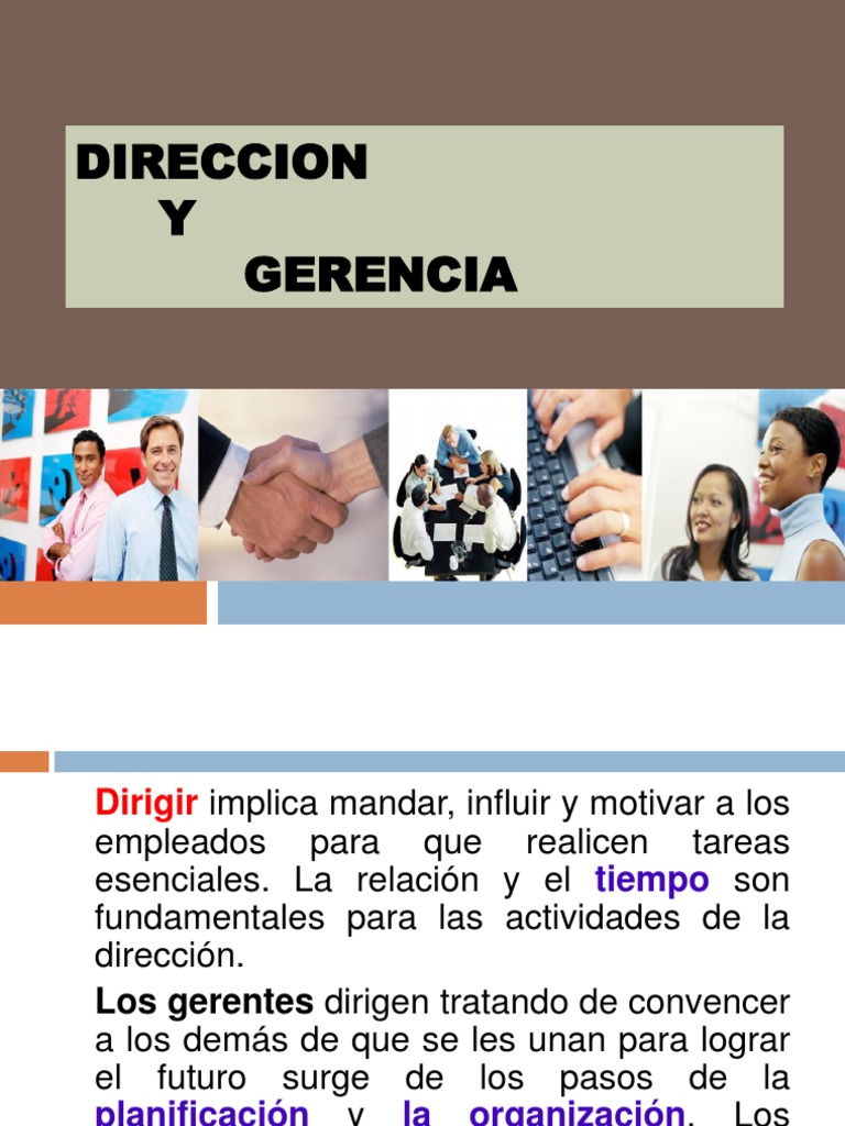 Dirigir implica mandar, influir y motivar a los empleados para que realicen tareas esenciales. La relacin y el tiempo son fundamentales para las actividades de la direccin. Los gerentes dirigen tratando de convencer a los dems de que se les unan para lograr el futuro surge de los pasos de la planificacin y la organizacin. Los gerentes al establecer el ambiente adecuado ayudan a sus empleados a hacer sus mejores esfuerzos.