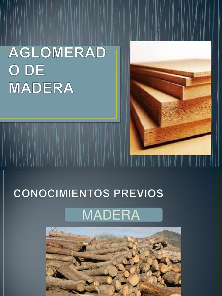 Un aglomerado es aquel elaborado con virutas de madera (que previamente se han desfibrado) mezcladas con resinas sintticas mediante fuerte presin y calor, en seco, hasta alcanzar una densidad media.
