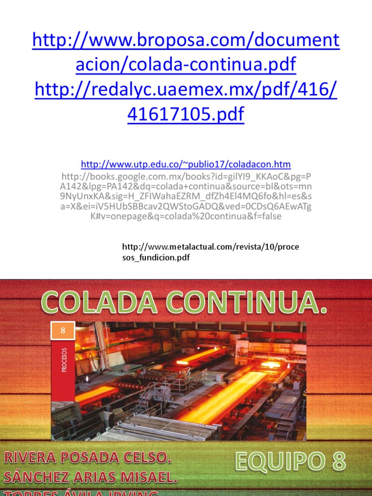 http://www.metalactual.com/revista/10/proceso s_fundicion.pdf http://books.google.com.mx/books?id=gilYI9_KK AoC&pg=PA142&lpg=PA142&dq=colada+continu a&source=bl&ots=mn9NyUnxKA&sig=H_ZFIWaha EZRM_dfZh4El4MQ6fo&hl=es&sa=X&ei=iV5HUbS BBcav2QWStoGADQ&ved=0CDsQ6AEwATgK#v=o nepage&q=colada%20continua&f=false http://www.utp.edu.co/~publio17/coladacon.ht m