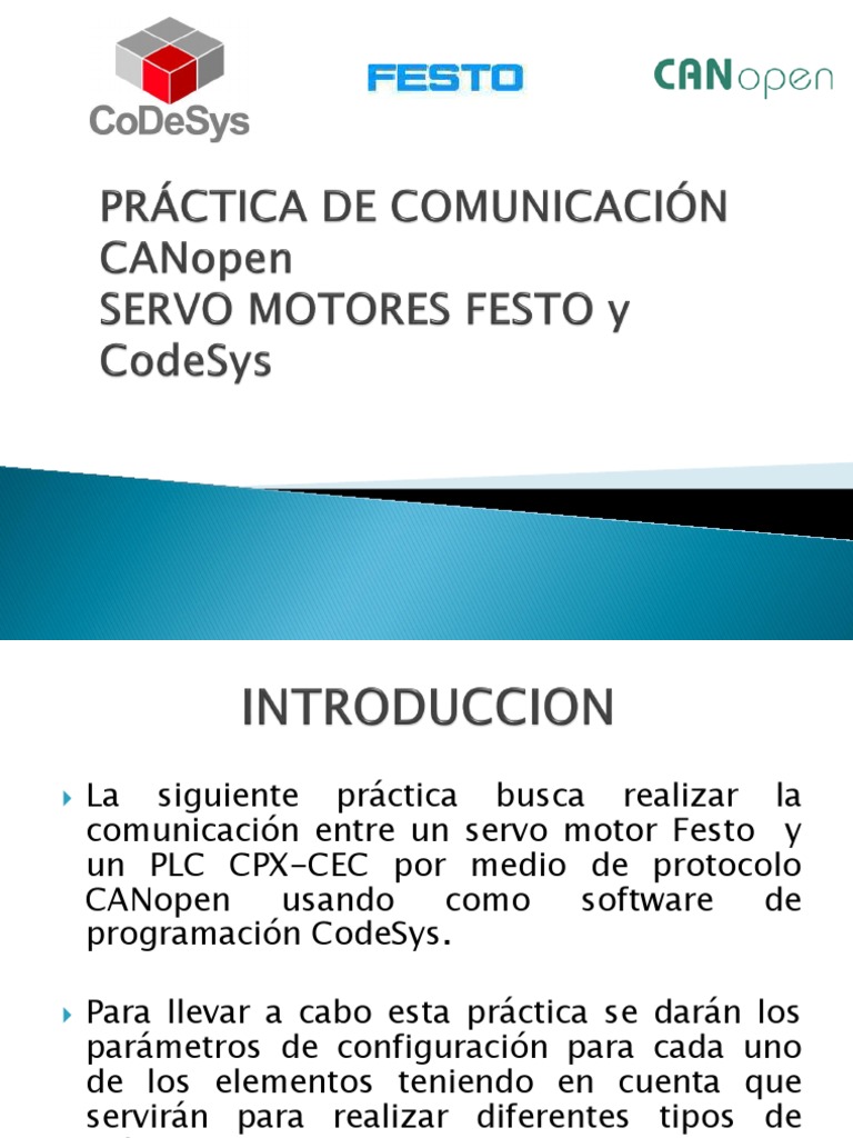 La siguiente prctica busca realizar la comunicacin entre un servo motor Festo y un PLC CPX-CEC por medio de protocolo CANopen