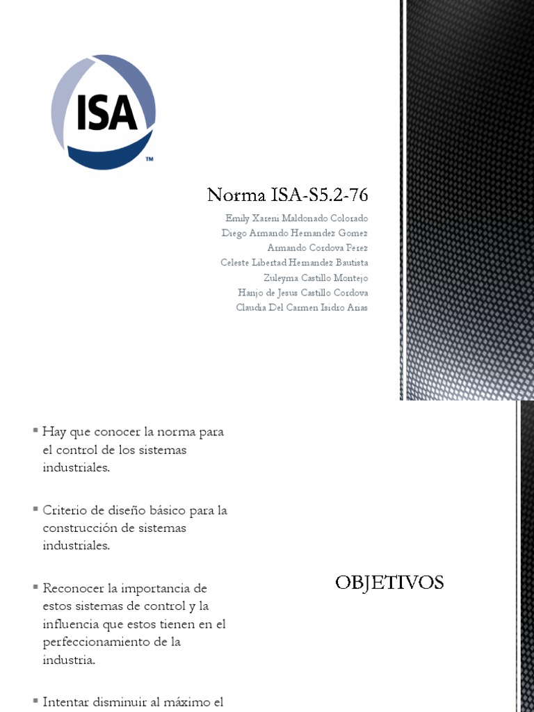 Esta norma lista los smbolos lgicos que representan operaciones con instalaciones binarios y sistemas secuenciales para el arranque, operacin, alarma y paro de procesos y equipos en la industria qumica, petroqumica, centrales de potencia, aire acondicionado y en otras numerosas industrias. Las operaciones binarias pueden ser realizadas por cualquier clase de hardware, sea elctrico, electrnico, fluidico, neumtico, hidrulico, mecnico, manual, ptico u otros.