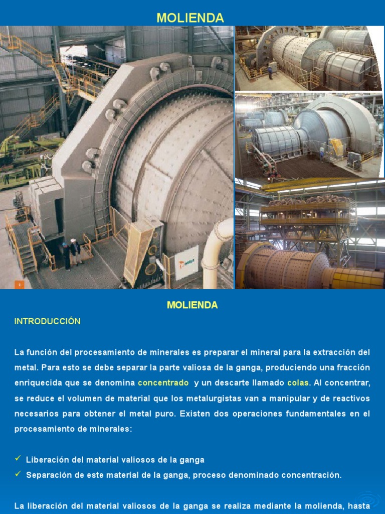 La molienda es la ltima etapa de reduccin de tamaos. En esta etapa las partculas