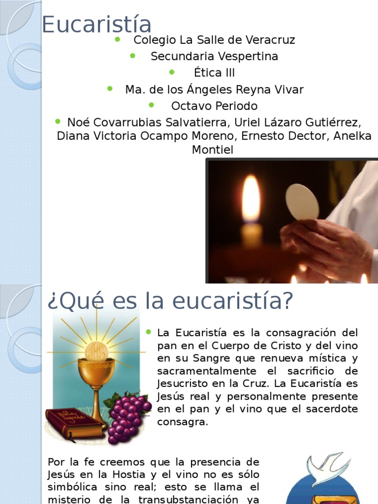 la Eucarista es el pan de trigo y vino de la vid". Esta es