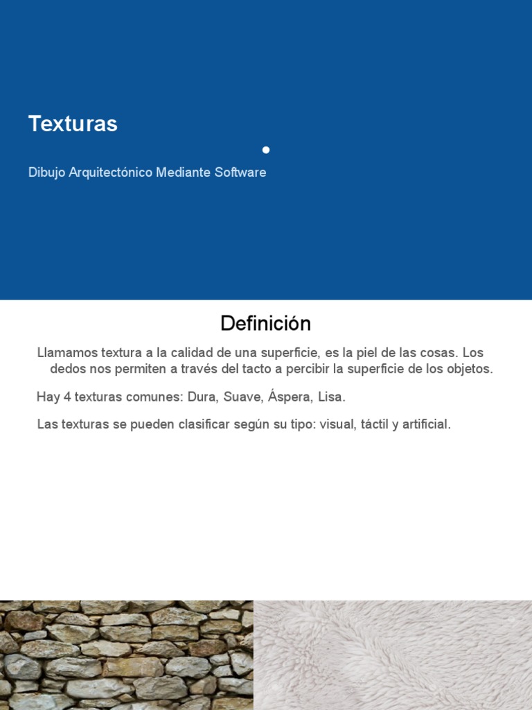 Las texturas se pueden clasificar segn su tipo: visual, tctil y artificial.