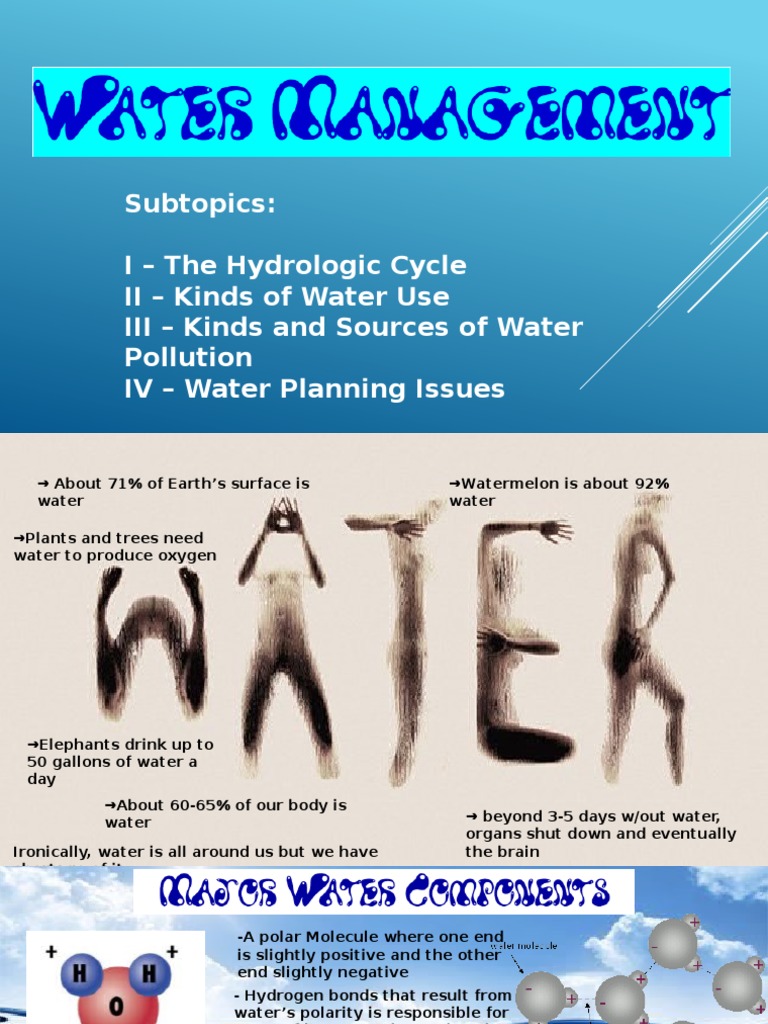 Stakeholder participation Implementing stakeholder participation as a basis for decision making that takes into account the best interests of society and the environment in the development and use of water resources in the basin. Pollution control Managing pollution using polluter pays principles and appropriate incentives to reduce most important pollution problems and minimize environmental and social impact. Monitoring Implementing effective monitoring systems that provide essential management information and identifying and responding to infringements of laws. maintaining minimum levels for social and environmental use while addressing equity and development needs of society. .Functions of water resources planning & management are very complex tasks and may involve many different activities conducted by many different players. regulations and permits. Economic and financial management Applying economic and financial tools for investment. cost recovery and behavior change to support the goals of equitable access and sustainable benefits to society form water use. River basin planning Preparing and regularly updating the Basin Plan incorporating stakeholder views on development and management priorities for the basin. The following components constitute water resources planning & management: Water Allocation Allocating water to major water users and uses. Information management Providing essential data necessary to make informed and transparent decisions and development and sustainable management of water resources in the basin.