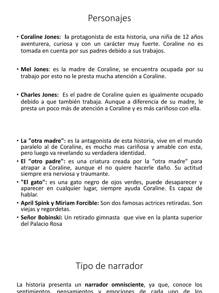 • Coraline Jones: la protagonista de esta historia, una niña de 12 años