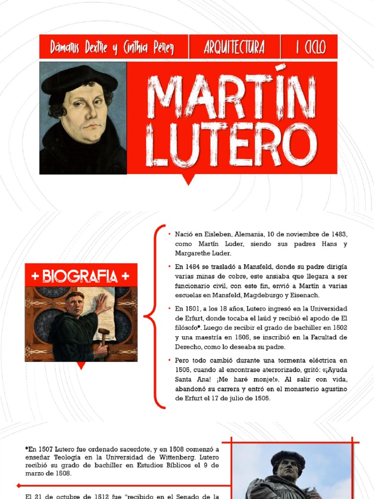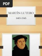 Martín Lutero nació en Alemania en 1483. Estudió en varias universidades y se unió a un monasterio agustino en 1505. En 1517, clavó 95 tesis criticando las indulgencias en la puerta de una iglesia, dando inicio a la Reforma Protestante. Fue excomulgado por el papa en 1521 después de negarse a retractarse de sus enseñanzas. Murió en 1546 después de pasar años defendiendo sus creencias y traduciendo la Biblia al alemán.