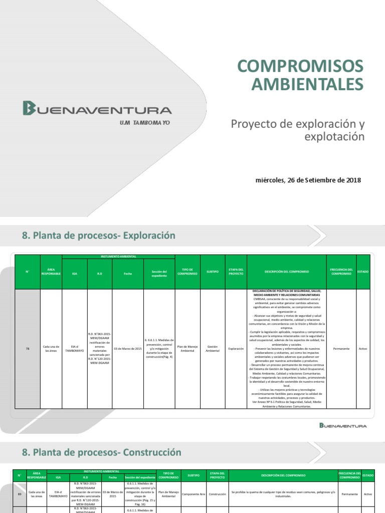 6.Exploración INSTUMENTO AMBIENTAL ÁREA TIPO DE ETAPA DEL FRECUENCIA DEL N° Sección del SUBTIPO DESCRIPCIÓN DEL COMPROMISO ESTADO RESPONSABLE IGA R. 4) ambientales y sociales adversos que pudieran ser R. . N°063-2015- asumidos por la empresa relacionados con la seguridad y MEM/DGAAM 6. SALUD. 6.1.Utilizas las mejores prácticas y tecnologías económicamente factibles para asegurar la calidad de nuestras actividades. los rectificación de prevención.Trabajar respetando las costumbres locales. Calidad y relaciones Comunitarias. Medidas de salud ocupacional. Medio Ambiente.1 Política de Seguridad.Alcanzar sus objetivos y metas de seguridad y salud ocupacional. Ver Anexo Nº 6. en concordancia con la Visión y Misión de la empresa. consciente de su responsabilidad social y ambiental. promoviendo la identidad y el desarrollo sostenible de nuestro entorno local. calidad y relaciones comunitarias. . control ambientales y sociales. . . además de los aspectos de calidad. se compromete como organización a: . N°120-2015- generados por nuestras actividades y productos. procesos y productos. Planta de procesos.Prevenir las lesiones y enfermedades de nuestros Permanente Activo las áreas TAMBOMAYO materiales Ambiental Ambiental durante la etapa de colaboradores y visitantes. Cada una de EIA-d errores Plan de Manejo Gestión 78 03 de Marzo de 2015 y/o mitigación Exploración .Desarrollar un proceso permanente de mejora continua del Sistema de Gestión de Seguridad y Salud Ocupacional. MEDIO AMBIENTE Y RELACIONES COMUNITARIAS CMBSAA. Salud. para evitar generar cambios adversos significativos en el ambiente.D.D Fecha COMPROMISO PROYECTO COMPROMISO expediente DECLARACIÓN DE POLÍTICA DE SEGURIDAD.1.Cumplir la legislación aplicable. medio ambiente. MEM-DGAAM . Medio Ambiente y Relaciones Comunitarias.D. requisitos y compromisos R.8. así como los impactos sancionada por construcción(Pág.